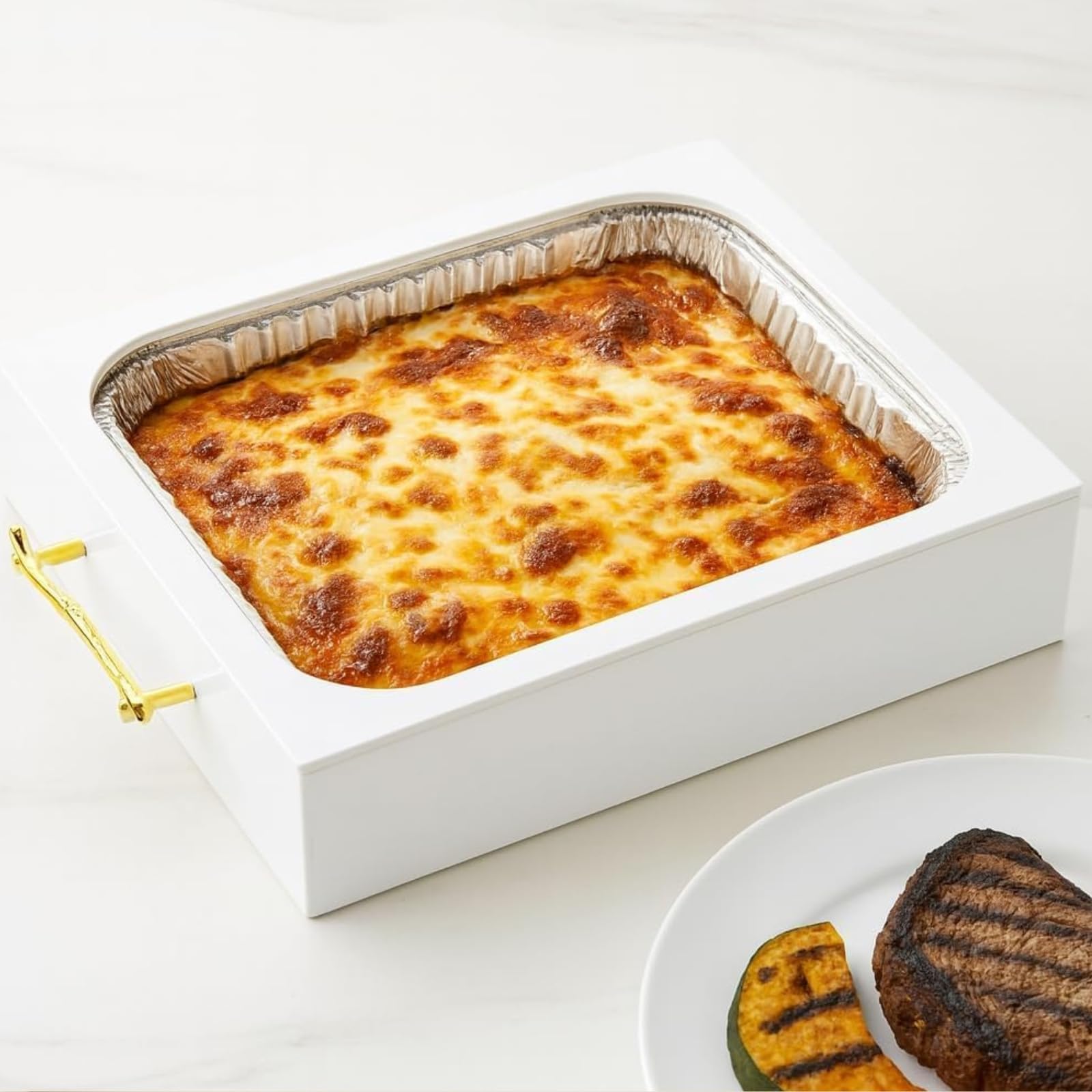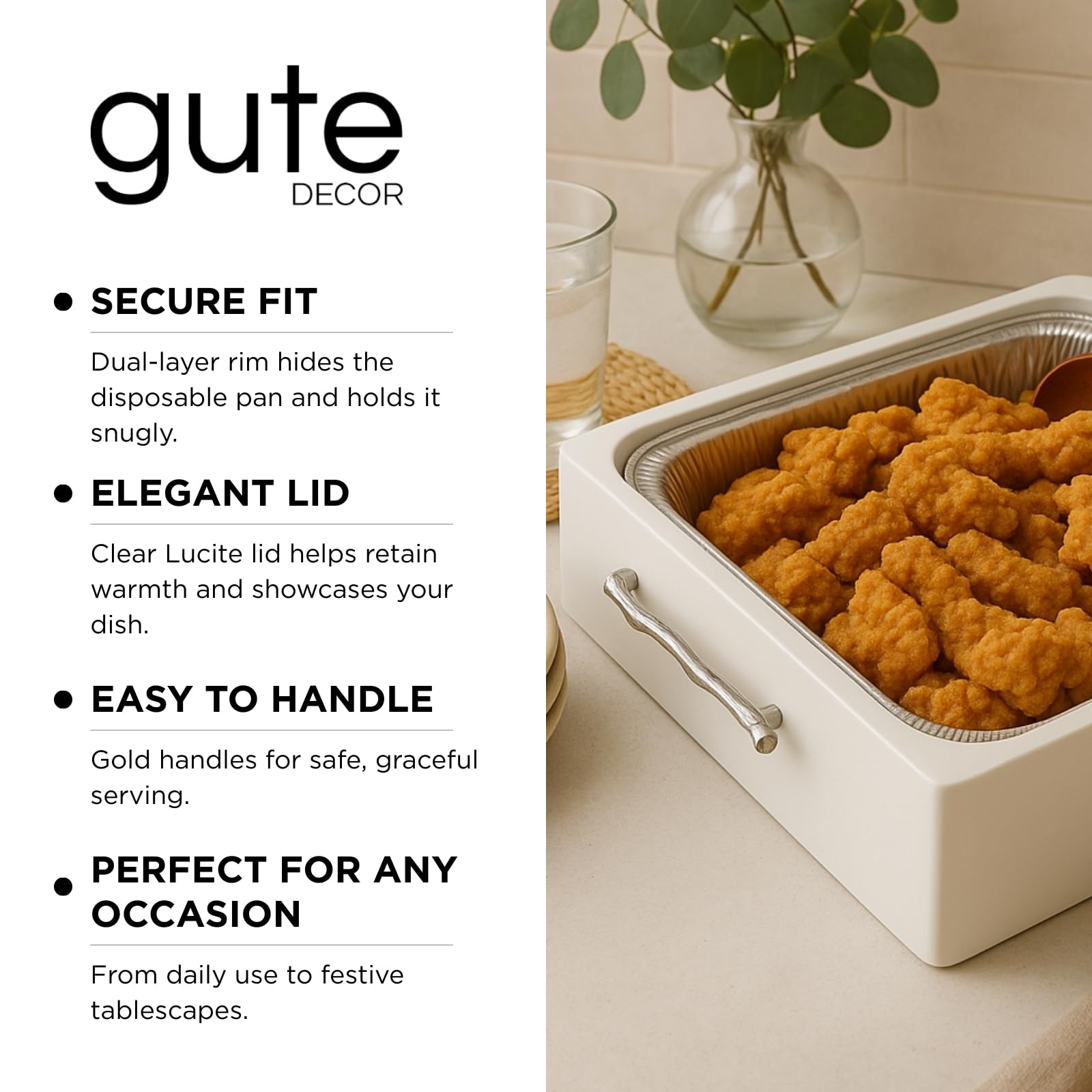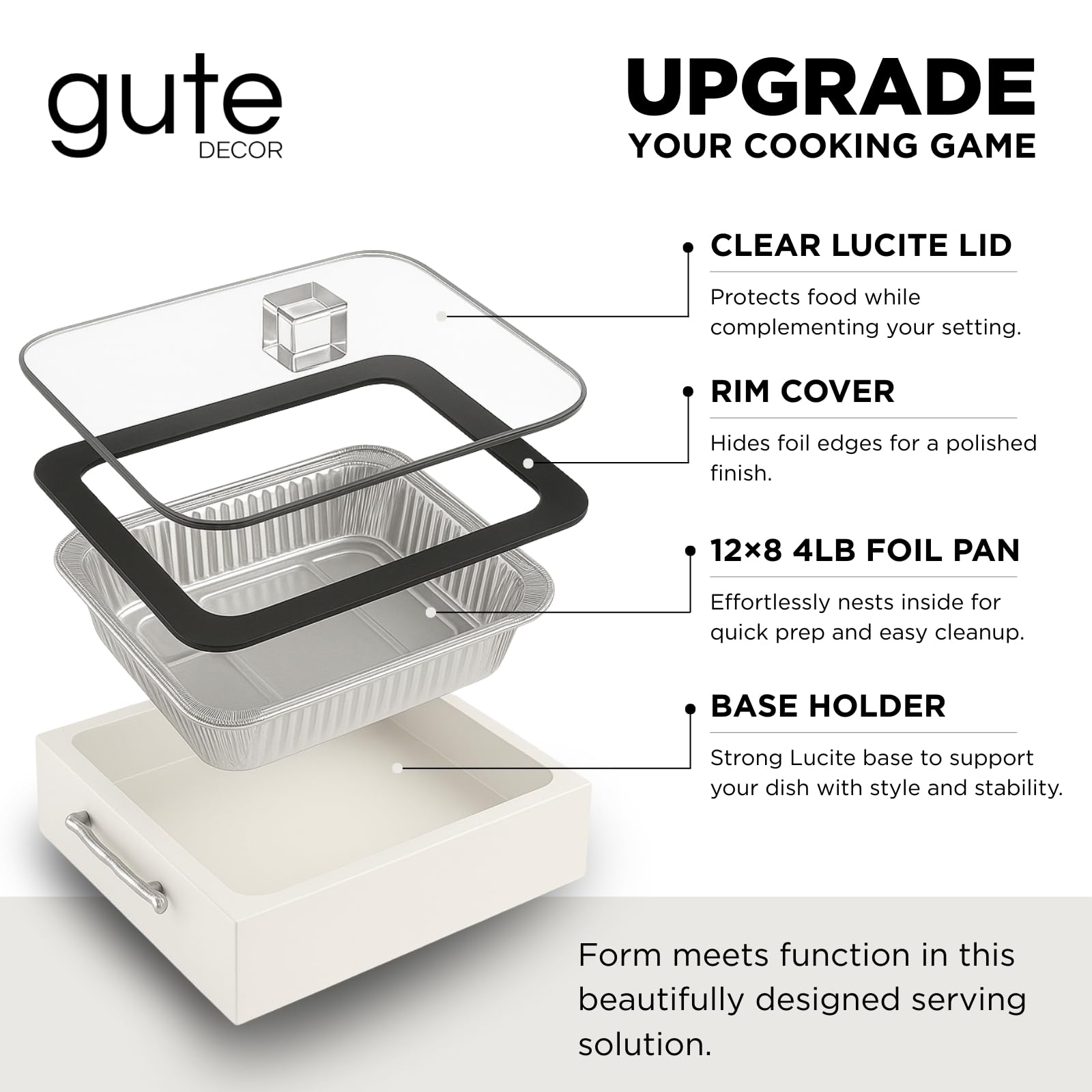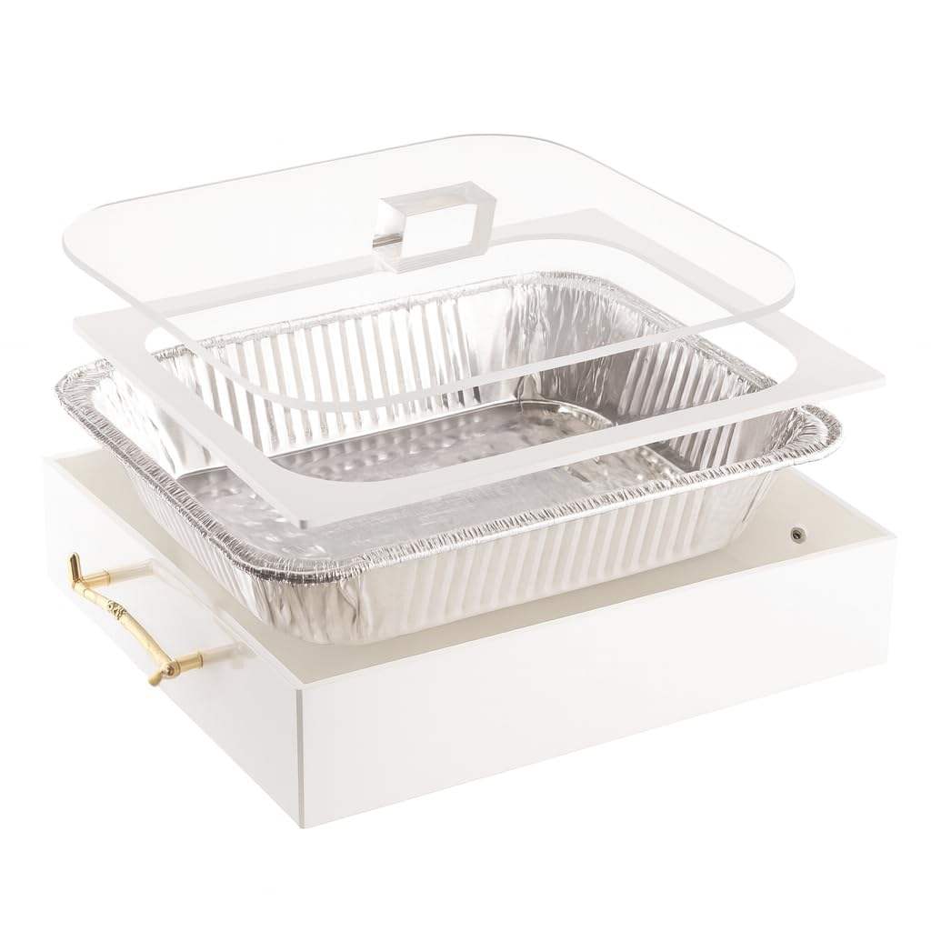 Upgrade your table presentation with the Gute Acrylic Pan Holder Set, a stylish solution for serving straight from disposable pans without compromising on design. This 3-piece set fits standard 9x13 foil pans and includes a clear acrylic base, a rim cover to conceal foil edges, and a matching lid to protect and serve your dishes in style. Designed with clean lines and a modern finish, it blends seamlessly into your kitchen, buffet setup, or dining display. Perfect for hosting, potlucks, or everyday use. Built-in handles make it easy to carry from counter to table. Note: Allow food to cool for 3–5 minutes after removing from the oven before placing into the holder. Avoid using the lid until the food is warm—not steaming.