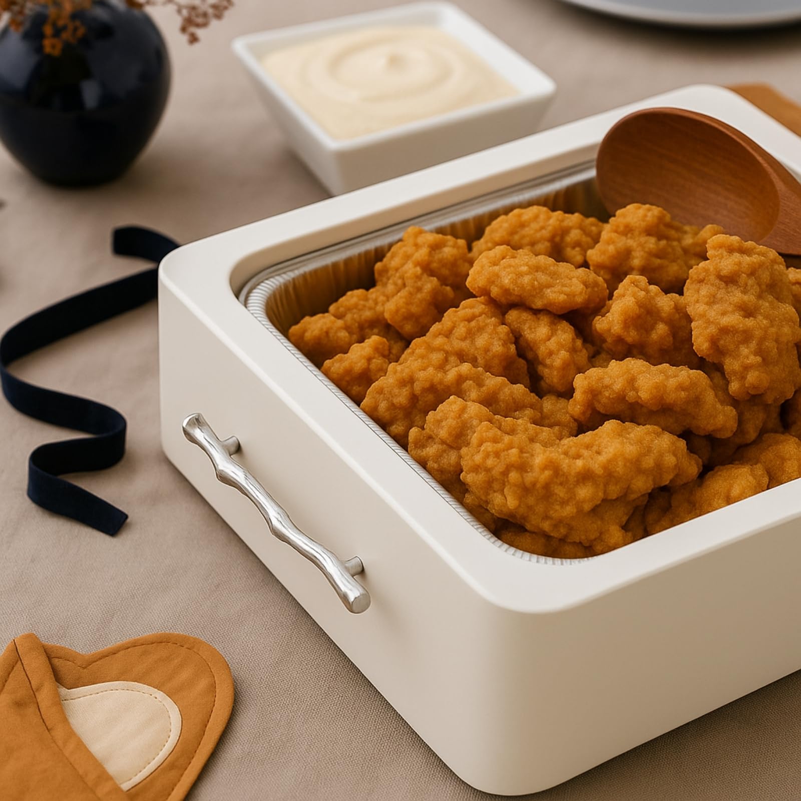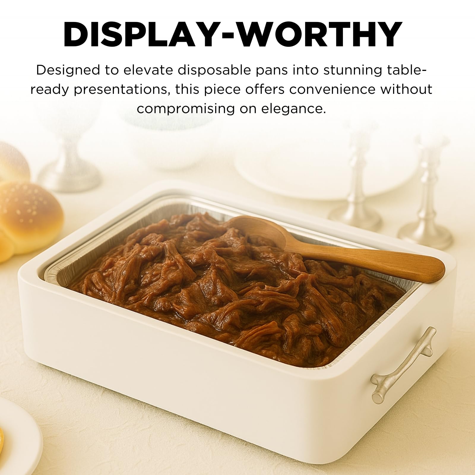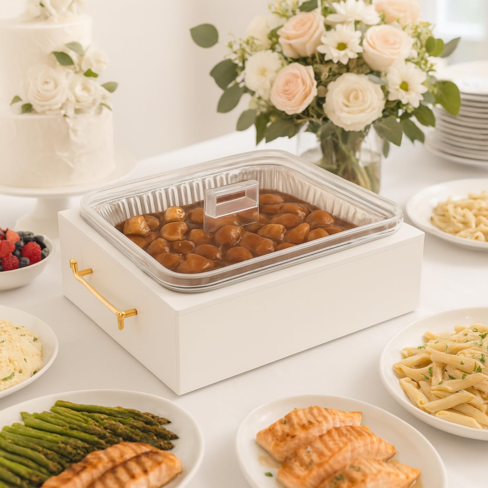 Upgrade your table presentation with the Gute Acrylic Pan Holder Set, a stylish solution for serving straight from disposable pans without compromising on design. This 3-piece set fits standard 9x13 foil pans and includes a clear acrylic base, a rim cover to conceal foil edges, and a matching lid to protect and serve your dishes in style. Designed with clean lines and a modern finish, it blends seamlessly into your kitchen, buffet setup, or dining display. Perfect for hosting, potlucks, or everyday use. Built-in handles make it easy to carry from counter to table. Note: Allow food to cool for 3–5 minutes after removing from the oven before placing into the holder. Avoid using the lid until the food is warm—not steaming.