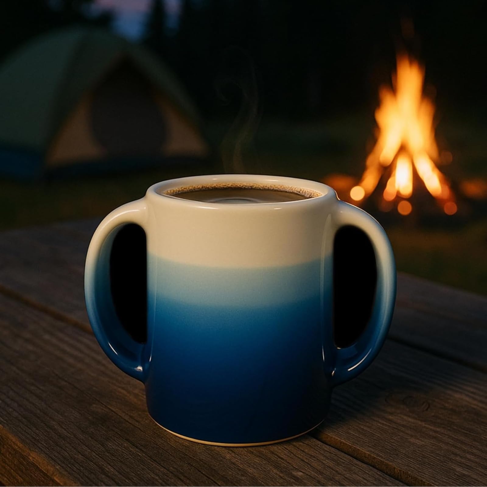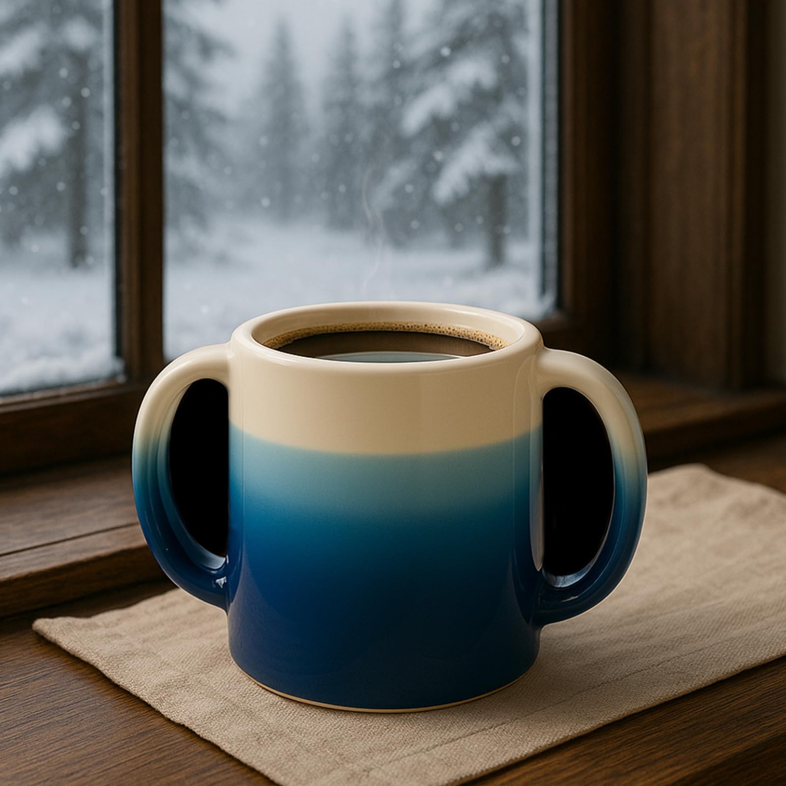 Stay Warm and Cozy with This Handmade Handwarmer Mug – Ergonomic Ceramic Coffee Mug with Right-Hand Pocket Grip  Enjoy the warmth of your favorite hot drinks like never before with this handcrafted ceramic handwarmer mug, specially designed for comfort and style. Unlike traditional mugs, this unique ergonomic mug features a sculpted hand pocket that cradles your right hand, keeping your fingers warm while you sip coffee, tea, or hot chocolate. Made from high-quality, lead-free clay, this 14 oz ceramic coffee mug is as functional as it is beautiful. The elegant white and blue pottery finish adds a rustic charm, perfect for cozy mornings on the porch or relaxing evenings by the fire.