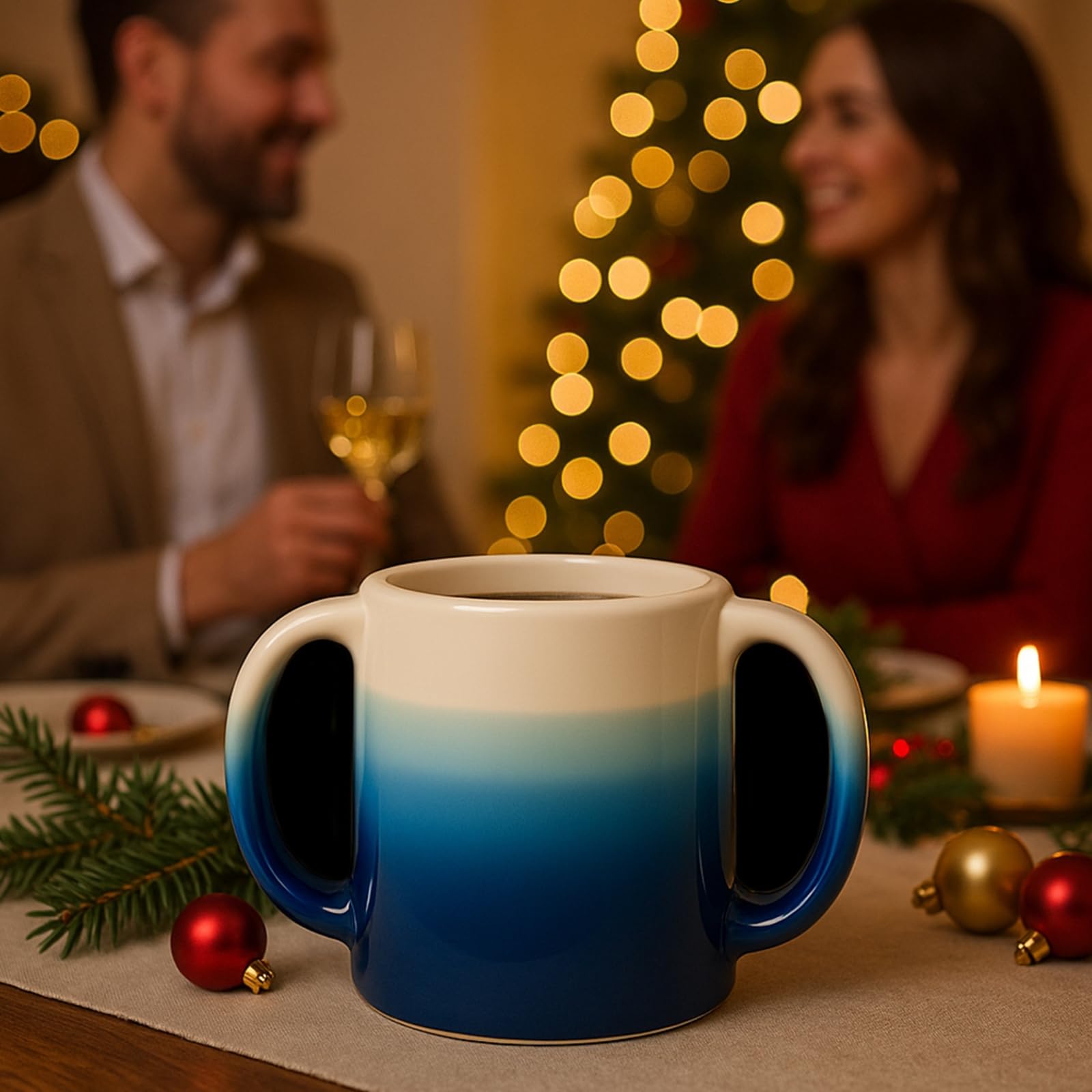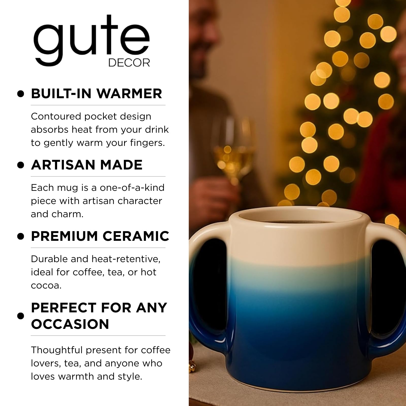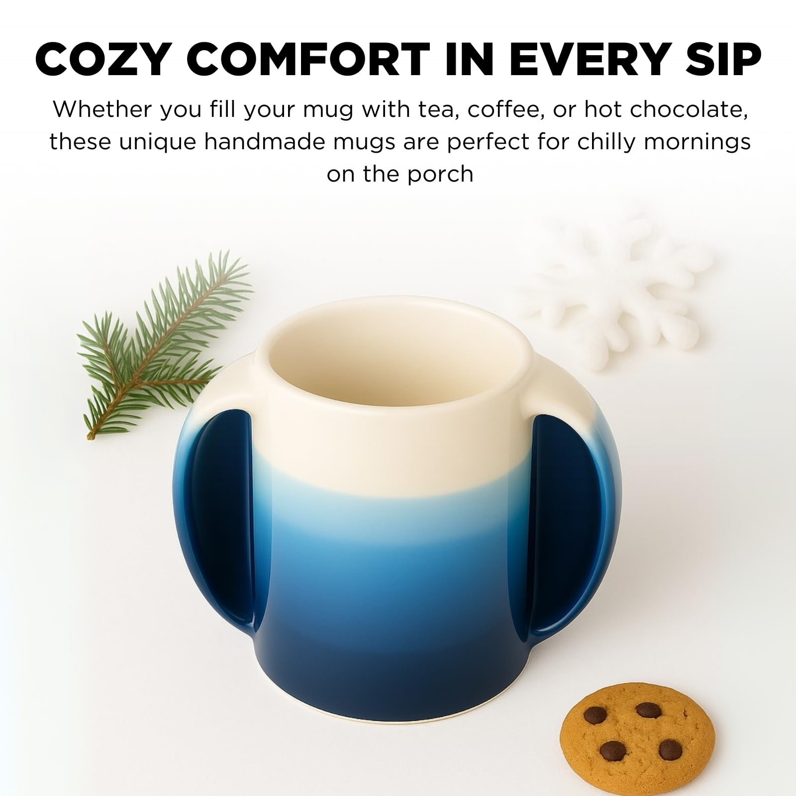 Double Hand Warmer Mug , Handmade Pottery - HandWarmer Contoured Pockets Both Hands will Hold Warmth From The Heat Of Your Drink To Keep Your Fingers Warm, Comfy Blue - Winter Stocking Stuffer Gift