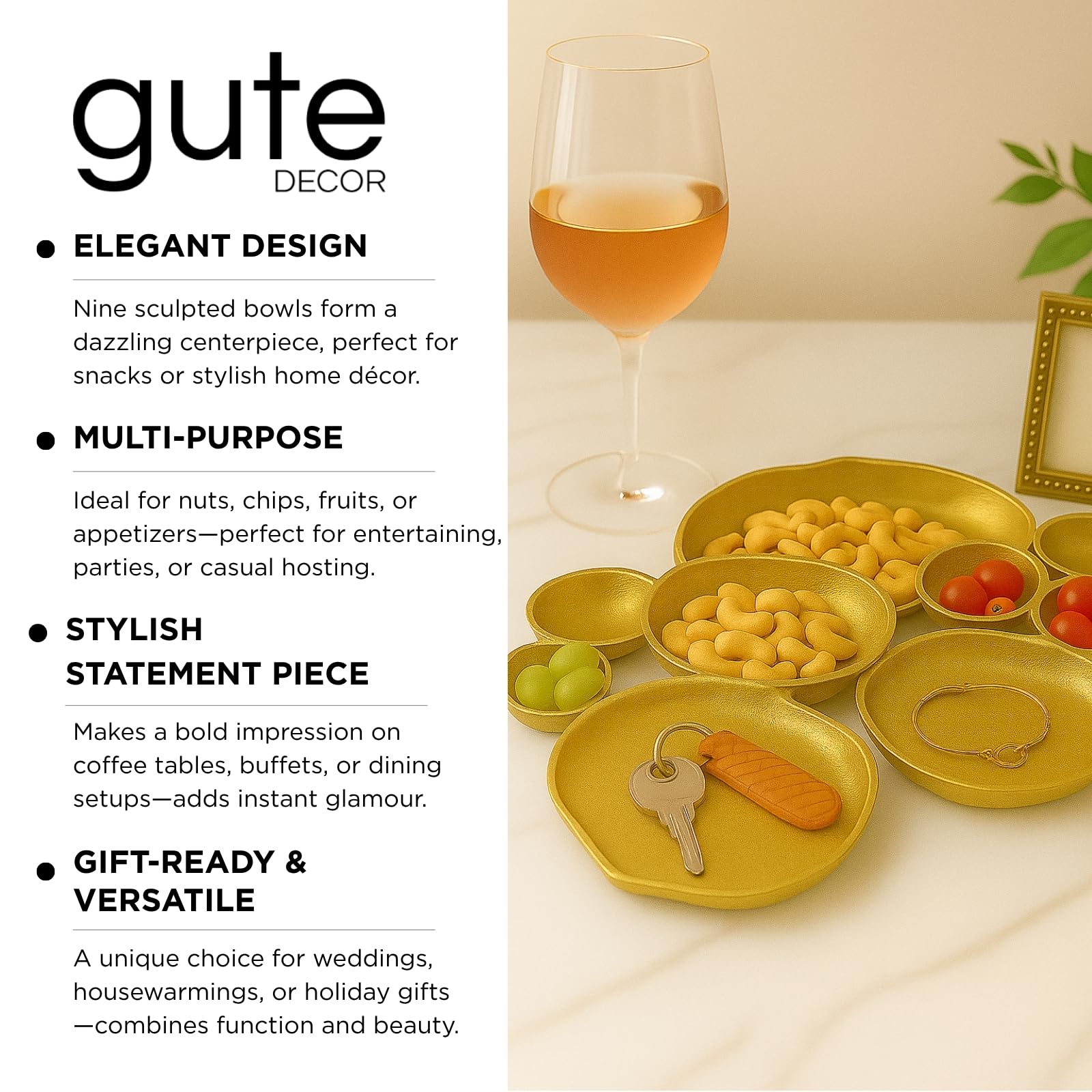 The perfect entertaining piece for your food, these gold colored appetizer serving bowls are the perfect size to serve up those party snacks at your next gathering. Add a touch of elegance to your kitchen with this dazzling gold-colored serving bowl. This beautiful dish features a cluster of nine different sized bowls, perfect for serving up small mountains of snacks and munchies. Perfect for nuts, chips or veggies for an appetizer buffet party or even as a decorative piece on display at home.