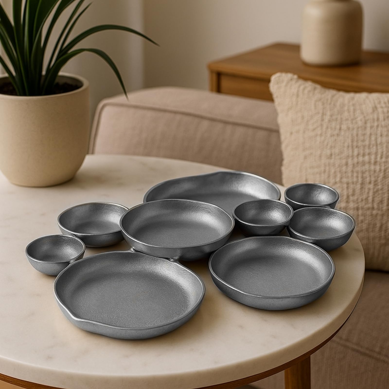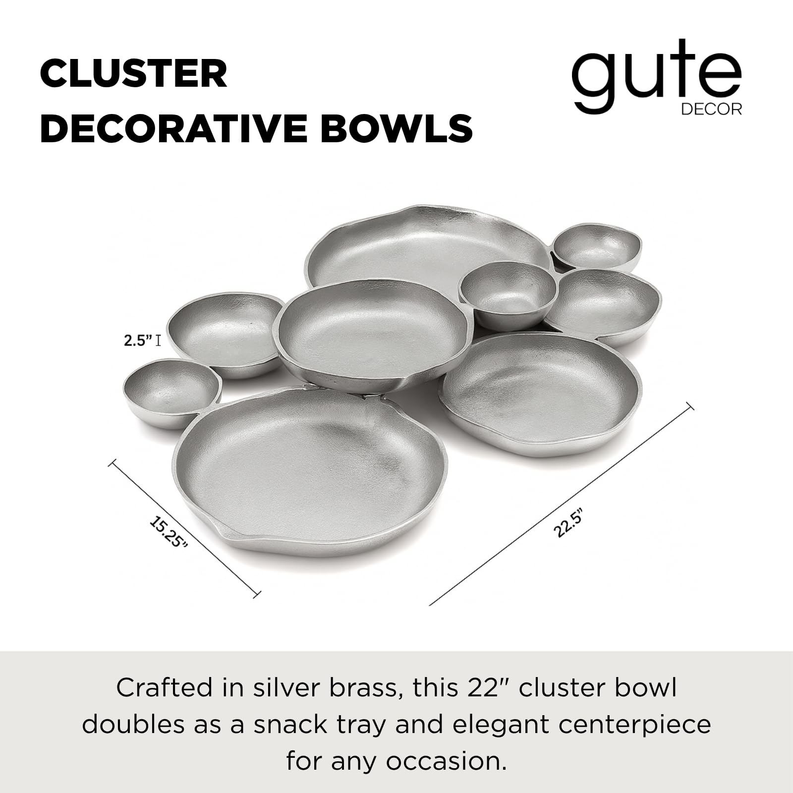 The perfect entertaining piece for your food, these silver colored appetizer serving bowls are the perfect size to serve up those party snacks at your next gathering. Add a touch of elegance to your kitchen with this dazzling silver-colored serving bowl. This beautiful dish features a cluster of nine different sized bowls, perfect for serving up small mountains of snacks and munchies. Perfect for nuts, chips or veggies for an appetizer buffet party or even as a decorative piece on display at home.